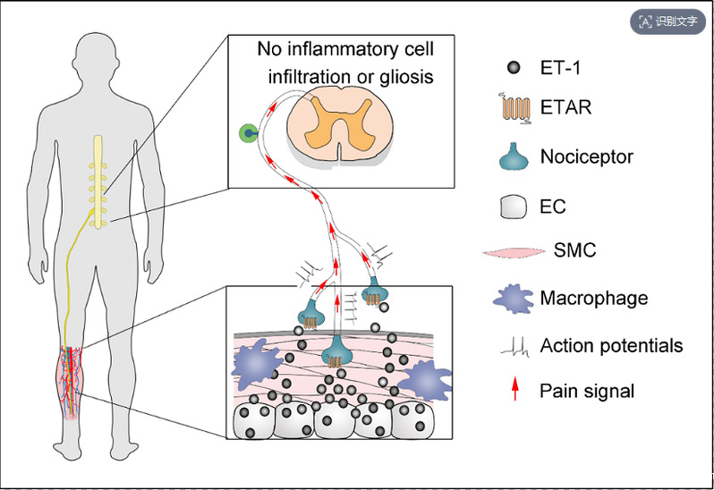 血管疾病有很多种,临床表现也各不相同,但疼痛是它们的共同症状。刘兴君教授课题组把血管疾病或血管功能失调所诱发的疼痛,命名为血管痛,其分子机制尚不清楚。该课题组首次以结扎实验鼠后肢表浅血管,来模拟临床血管疾病建立血管痛动物模型。综合运用多种实验方法和多种转基因鼠,结合光遗传学和化学遗传学方法激活血管内皮细胞,发现血管痛的疼痛表型只有机械痛敏、而没有热痛敏和冷痛敏,神经系统内也未见免疫细胞浸润和胶质细胞激活,证明血管痛是一种不同于神经病理性痛和炎性痛的一新型疼痛。进一步研究发现,血管内皮来源的、而不是血管平滑肌或巨噬细胞来源的ET-1,作用于伤害性感受器上的ETAR,通过内皮细胞-伤害性初级感觉神经-脊髓环路来调控血管痛的。